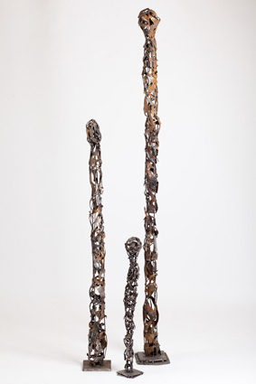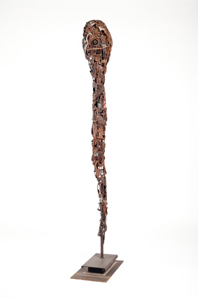 Meine Zeitstabfiguren entstehen als offene Edition: sie erwachsen aus unzähligen, kleinen Stahlfetzen, die Segmente formen sich, verdichten sich im Schmiedeprozess und stehen sinnbildlich für alle Dialogformen. Alles wird in der Zukunft gesammelt und transformiert, die Gesamtheit aus Annäherungen und Empfindungen bilden die Figur. Meine künstlerische Arbeit ist geprägt vom Auffinden, Zusammentragen und Chiffrieren. Ich positioniere die Schrottfunde in neue Wesenheiten. Material aus dem Arbeitsprozess wie Asche, Kohle oder Sand komplementieren sich Bildkörper und Assemblagen.
