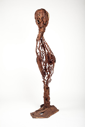 Les figurines de mon temps sont des éditions ouvertes : elles naissent d’innombrables petits lambeaux d’acier, les segments se forment, se condensent dans le processus de forgeage et symbolisent toutes les formes de dialogue. Tout est recueilli et transformé dans le futur, l’ensemble des approches et des sensations forment la figure. Mon travail artistique se caractérise par la recherche, la collecte et le chiffrement. Je positionne les trouvailles de ferraille dans de nouvelles entités. Les matériaux issus du processus de travail, tels que la cendre, le charbon ou le sable, se complètent les uns les autres sous forme de corps et d’assemblages picturaux.